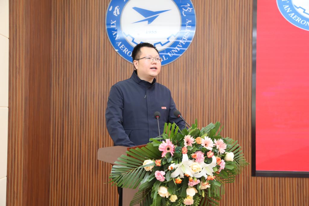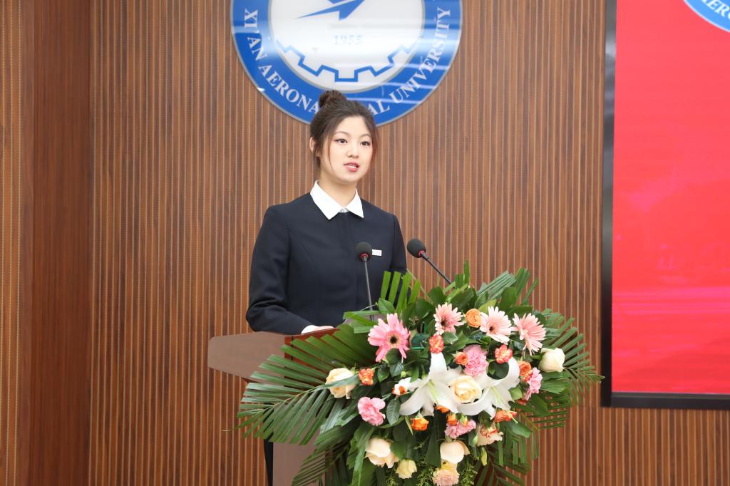 员工代表航空服务艺术与管理专业梁铭同学号召同学们在新的公司不负青春韶华,做有思想、有血肉、有信念的人。