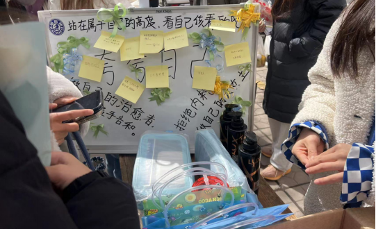 活动中,同学们在便利贴上书写了赞美自己的话语,并在白板、帐篷、横幅等地进行粘贴分享,同时现场进行抽奖。