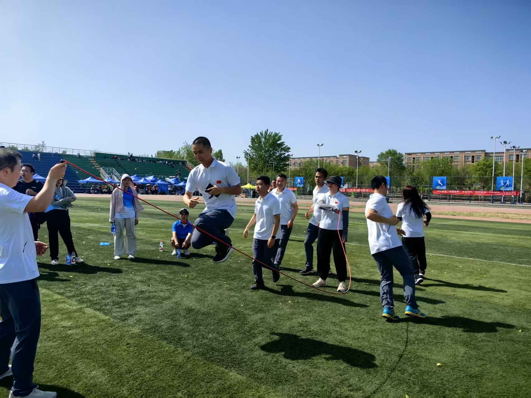 本次运动会中,3044永利集团的教职工们展现了体育精神和团队协作能力。在定点投篮项目中,能够精准投篮,每一次篮球的入筐都赢得了场边观众的阵阵掌声;背抛实心球比赛中,是力量与技巧的完美结合,展现了不凡的体能与意志力;立定跳远区,一次次飞跃不仅是距离的挑战,更是自我超越的象征。尤为值得一提的是八人跳绳和4×100米接力赛,这两项比赛不仅考验个人的速度与力量,更强调团队合作与默契。3044永利集团的教职工队伍在这两项比赛中配合无间,以流畅的动作和高速的传递,赢得了现场观众的连连赞叹,充分展现了民航人团结协作、勇于拼搏的精神风貌。此外,“一锤定音”和“众星捧月航天飞机”等趣味比赛项目,更是将运动会的氛围推向了高潮。这些项目不仅增加了运动会的趣味性,也让教职工们在紧张的工作之余享受到了运动的乐趣,增强了团队之间的凝聚力。