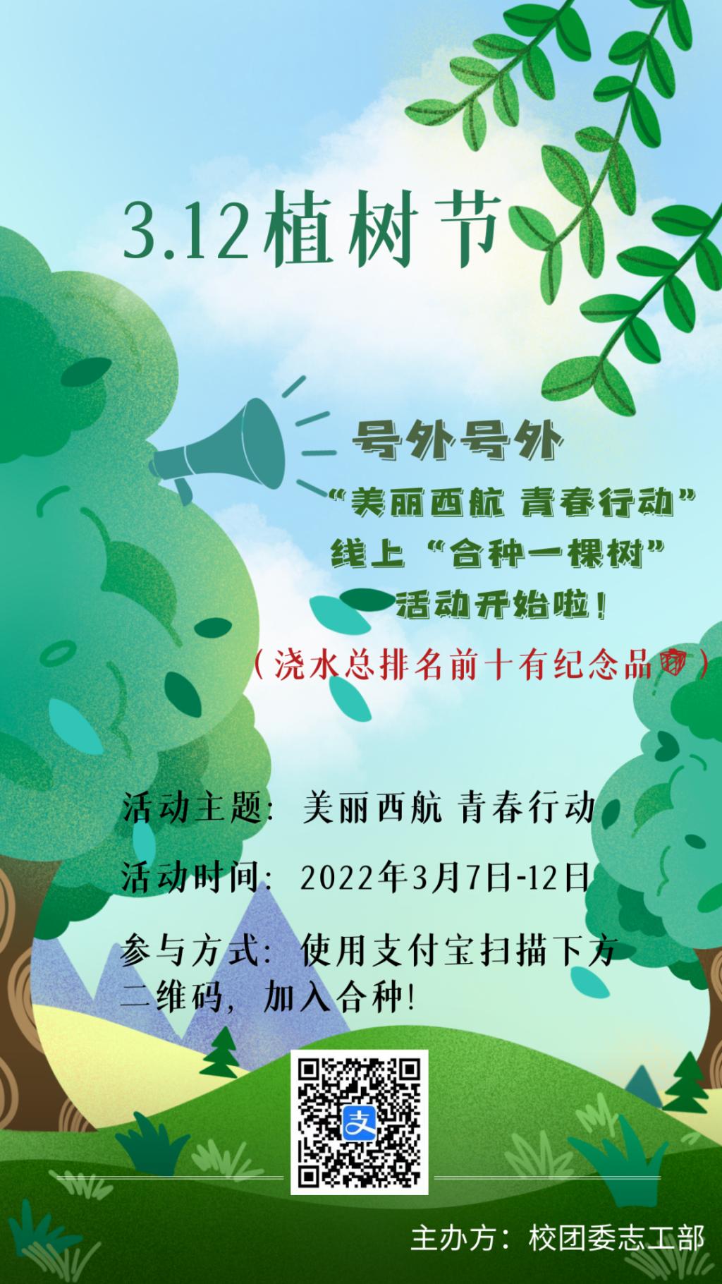 为营造植绿、爱绿、护绿、兴绿的良好氛围,提高西航学子的生态环保绿色低碳意识,2022年3月7日——2022年3月12日,由共青团3044永利官网委员会主办的"美丽西航 青春行动”植树节线上“合种一棵树”活动开始啦!